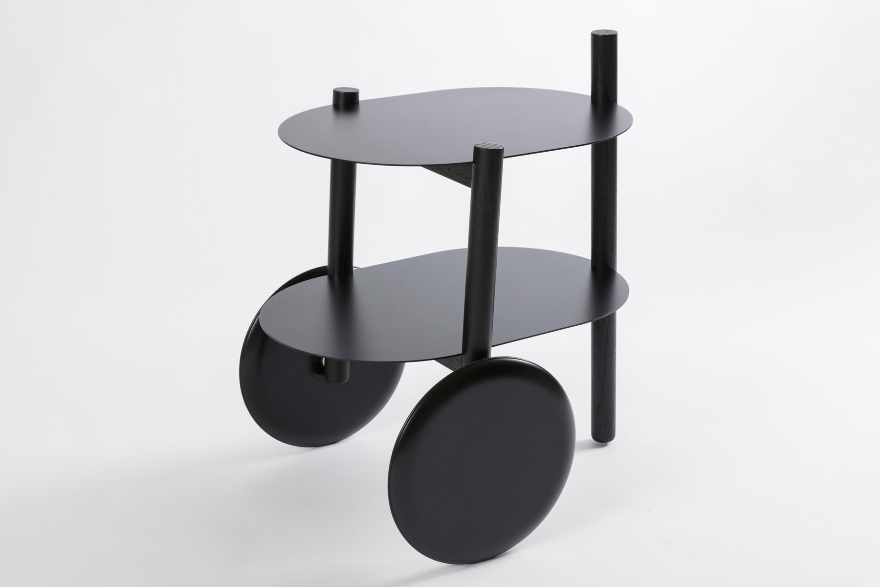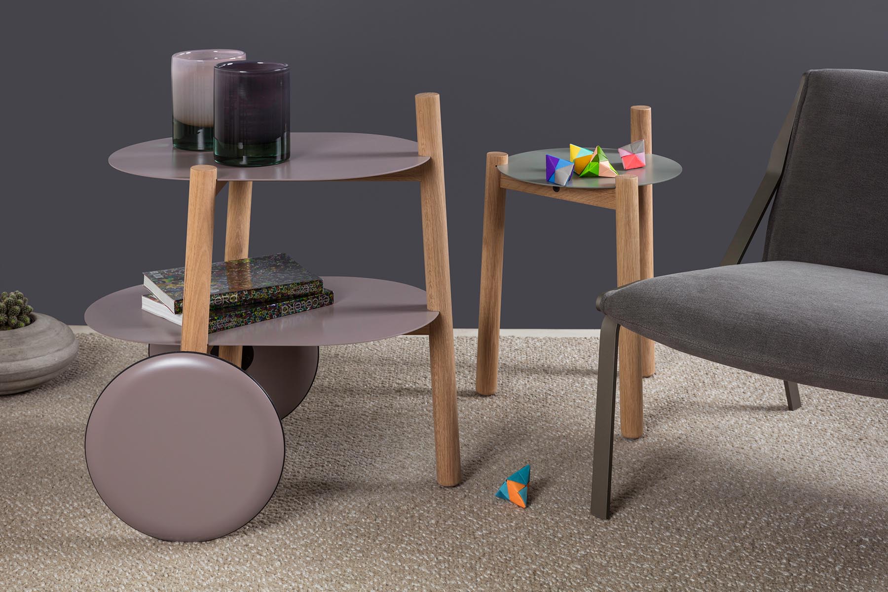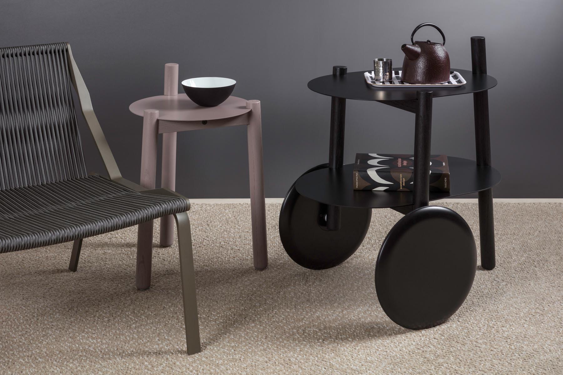 Los carros y mesas auxiliares Lollipop están resueltos por discos de acero que se insertan en una estructura de madera de roble macizo. Las formas redondeadas, los juegos de escala y la paleta de color le otorgan a las piezas un aspecto lúdico.