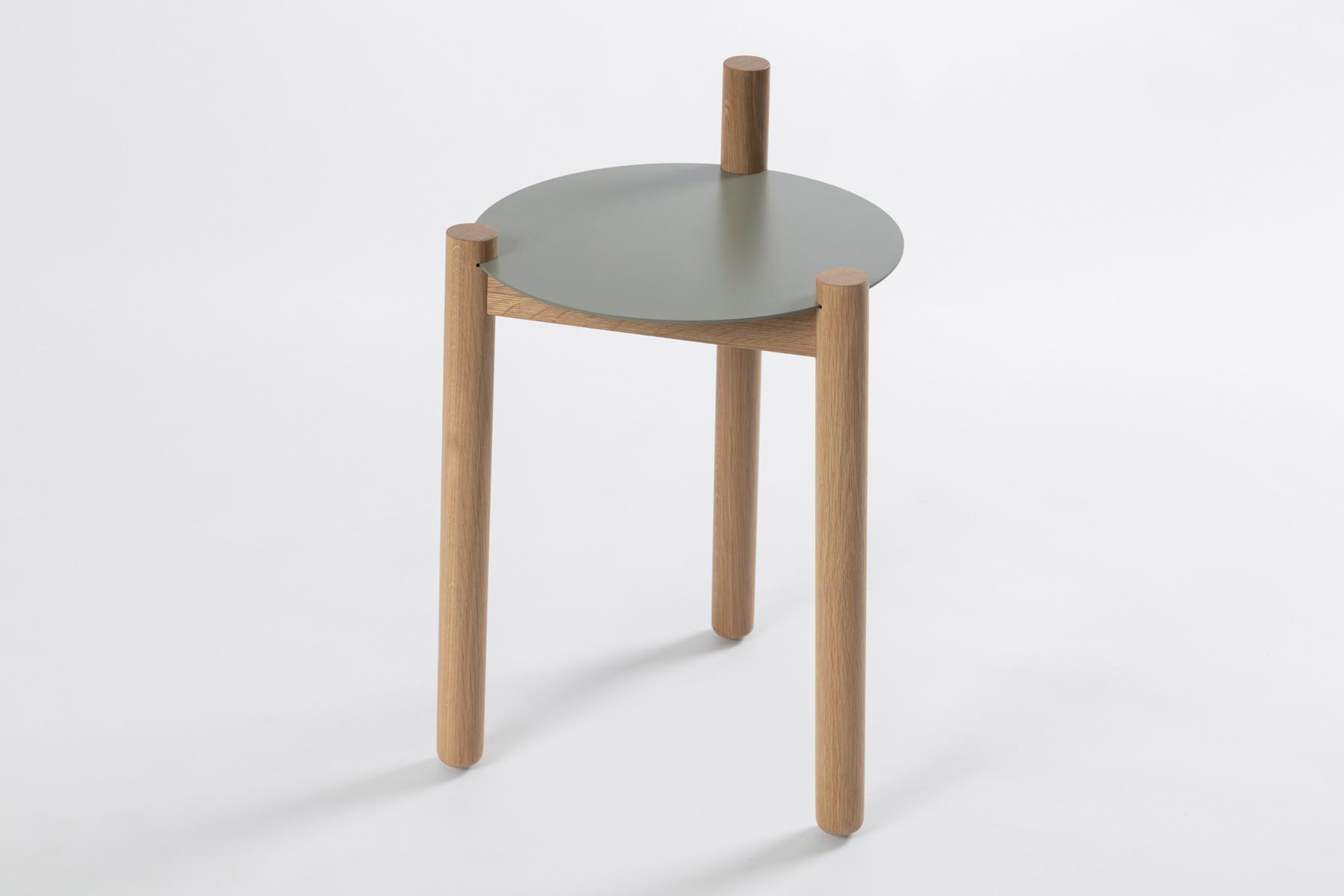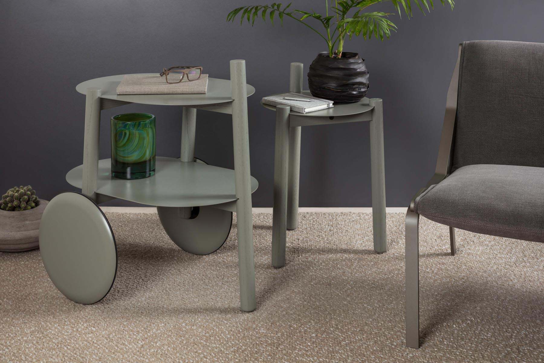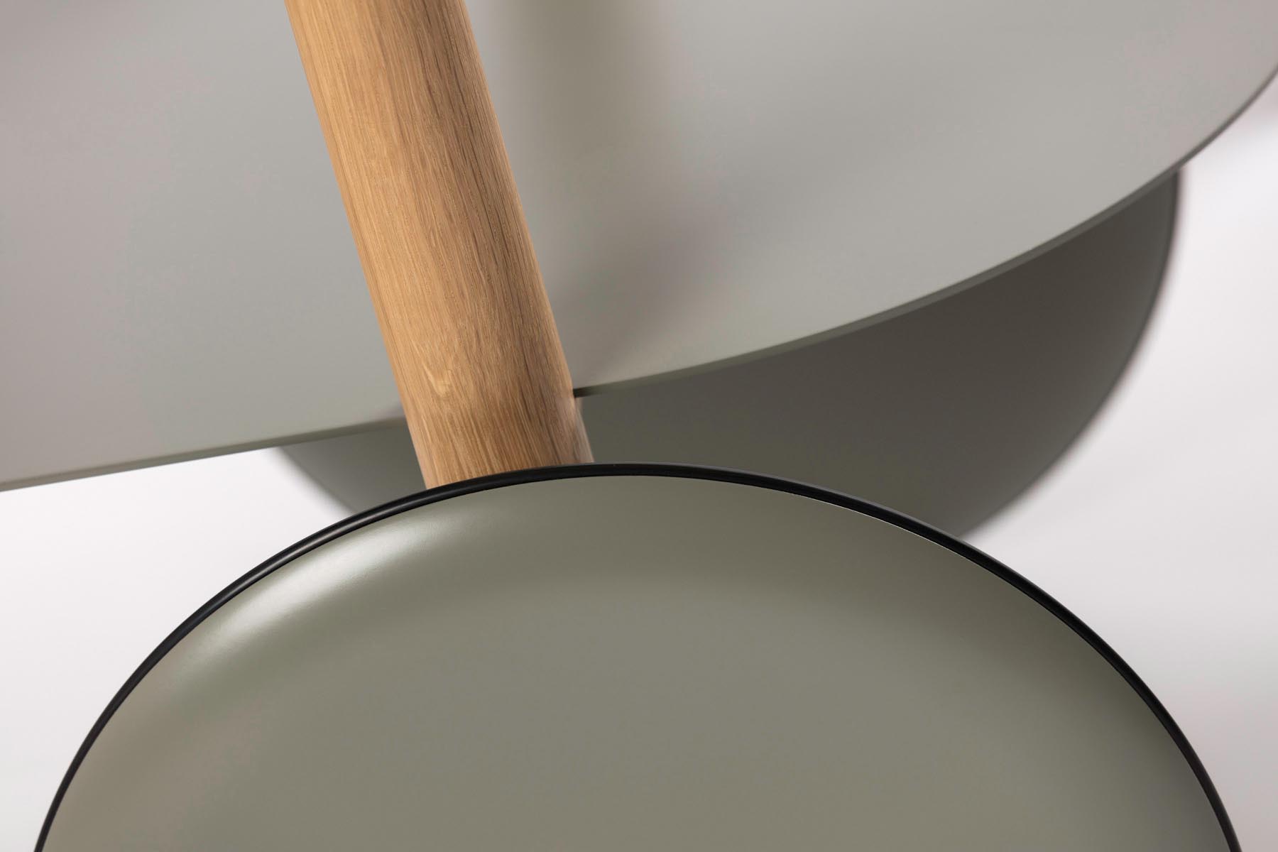 Los carros y mesas auxiliares Lollipop están resueltos por discos de acero que se insertan en una estructura de madera de roble macizo. Las formas redondeadas, los juegos de escala y la paleta de color le otorgan a las piezas un aspecto lúdico.